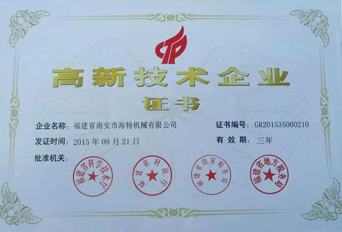 2015年12月8日,福建省科技廳政府信息公開網公布福建省科學技術廳通知文件(閩科高[2015]37號):根據《高新技術企業(yè)認定管理辦法》(國科發(fā)火[2008]172號)和《高新技術企業(yè)認定管理工作指引》(國科發(fā)火[2008]362號)有關規(guī)定以及《關于福建省2015年第一批高新技術企業(yè)備案的復函》(國科火字[2015]235號),認定海特機械有限公司為福建省2015年高新技術企業(yè)。